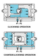For clockwise operation, Port 2 (P2) is open to atmosphere and air pressure is directed to Port 1 (P1). As the pistons move apart, the pinion rotates clockwise. The linear movement of the pistons is converted to rotary motion by the piston racks and the output pinion gear.