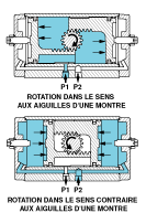 Pour une rotation dans le sens contraire aux aiguilles d'une montre, le Port 1 est mis à l'air libre et le Port 2 est mis sous pression.